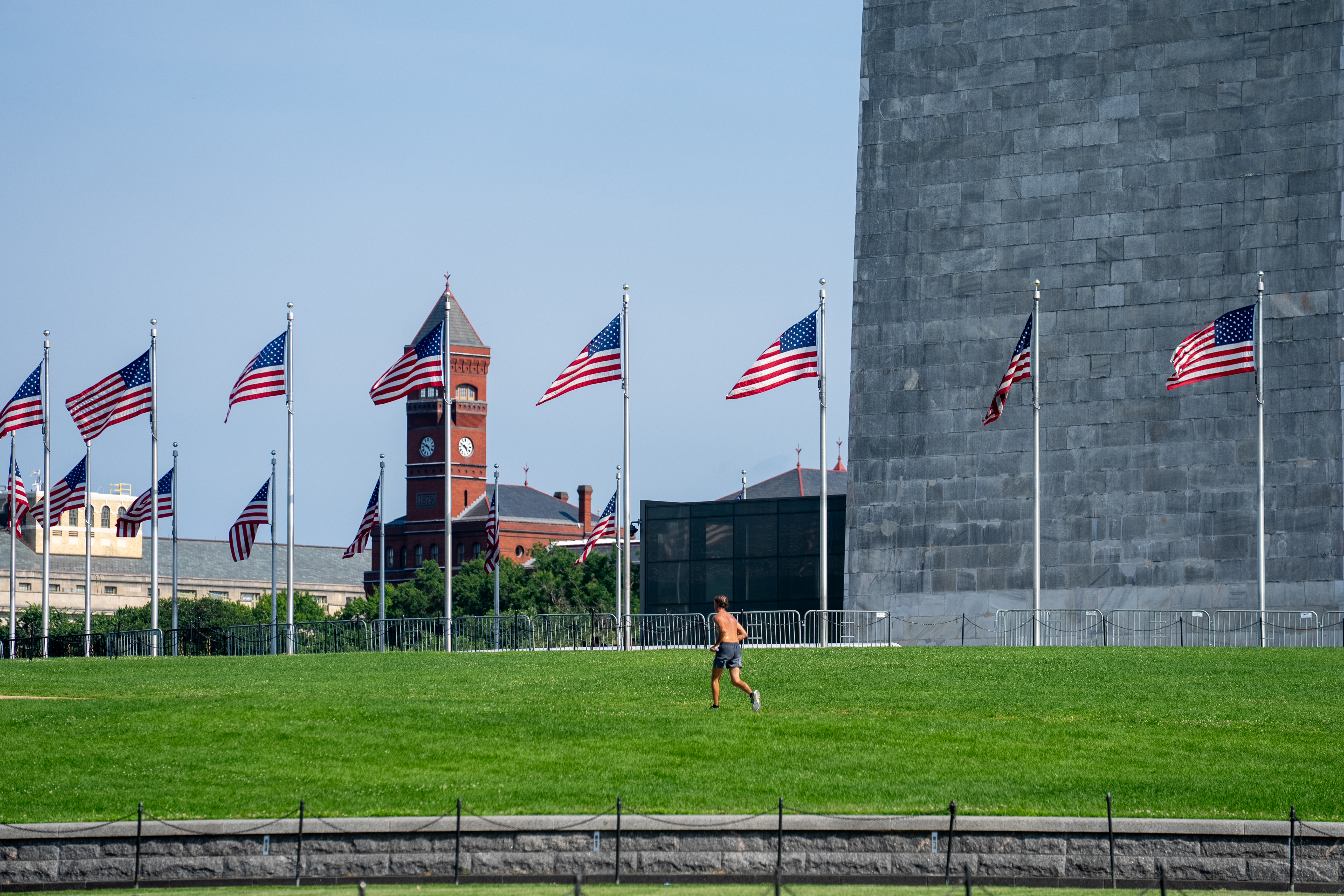 6月23日,在美国首都华盛顿,一名男子在草地上跑步。新华社记者胡友松摄