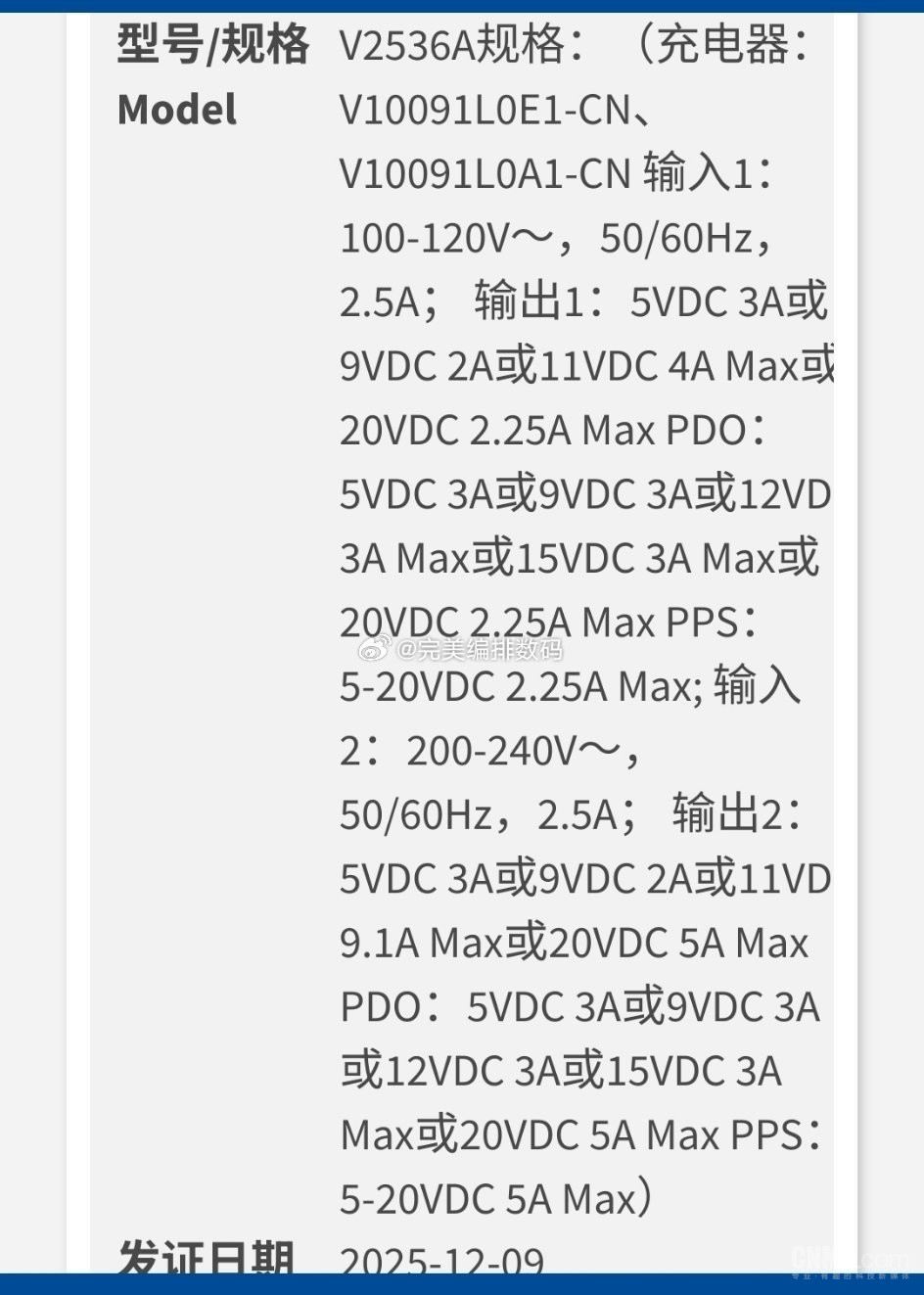 【CNMO科技消息】12月10日永星速配,有博主发文称,一款型号为V2536A的vivo新机已通过国家质量认证,并支持100W有线快充。CNMO注意到,其评论区的网友猜测这款机型或为vivo X300永星速配 Ultra。
