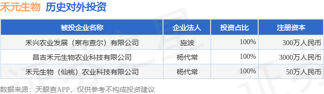 本站消息,根据天眼查APP显示,禾元生物(688765.SH)新增一起对外投资事件,被投资公司为禾兴农业发展(察布查尔)有限公司天盈配资,法定代表人施波,投资占比为100%。该公司从事研究和试验发展,注册资本为300万人民币。目前,禾元生物共存在对外投资3项,详见下表: