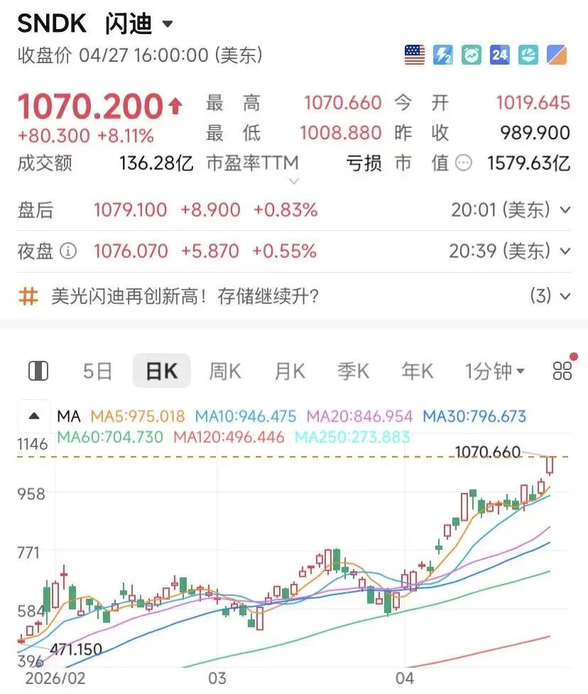 存储芯片概念股同步走高,闪迪涨8.11%,美光科技涨5.6%,希捷科技涨1.64%,三者股价均创下新高。