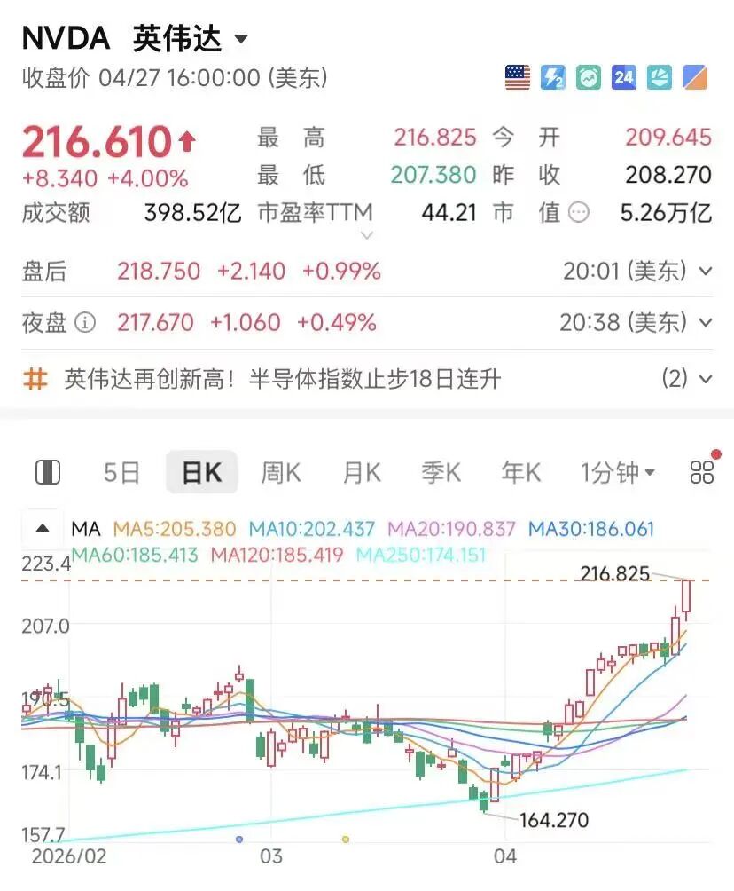 当地时间4月27日,美股三大股指收盘涨跌不一,标普500指数、纳指续创收盘新高。大型科技股多数上涨,英伟达单日收涨4%,收盘价触及216.61美元的历史峰值,市值随之攀升至5.26万亿美元,较全球第二大市值公司Alphabet高出逾1万亿美元。此外,存储芯片三巨头闪迪、美光科技、希捷科技股价均创下新高。