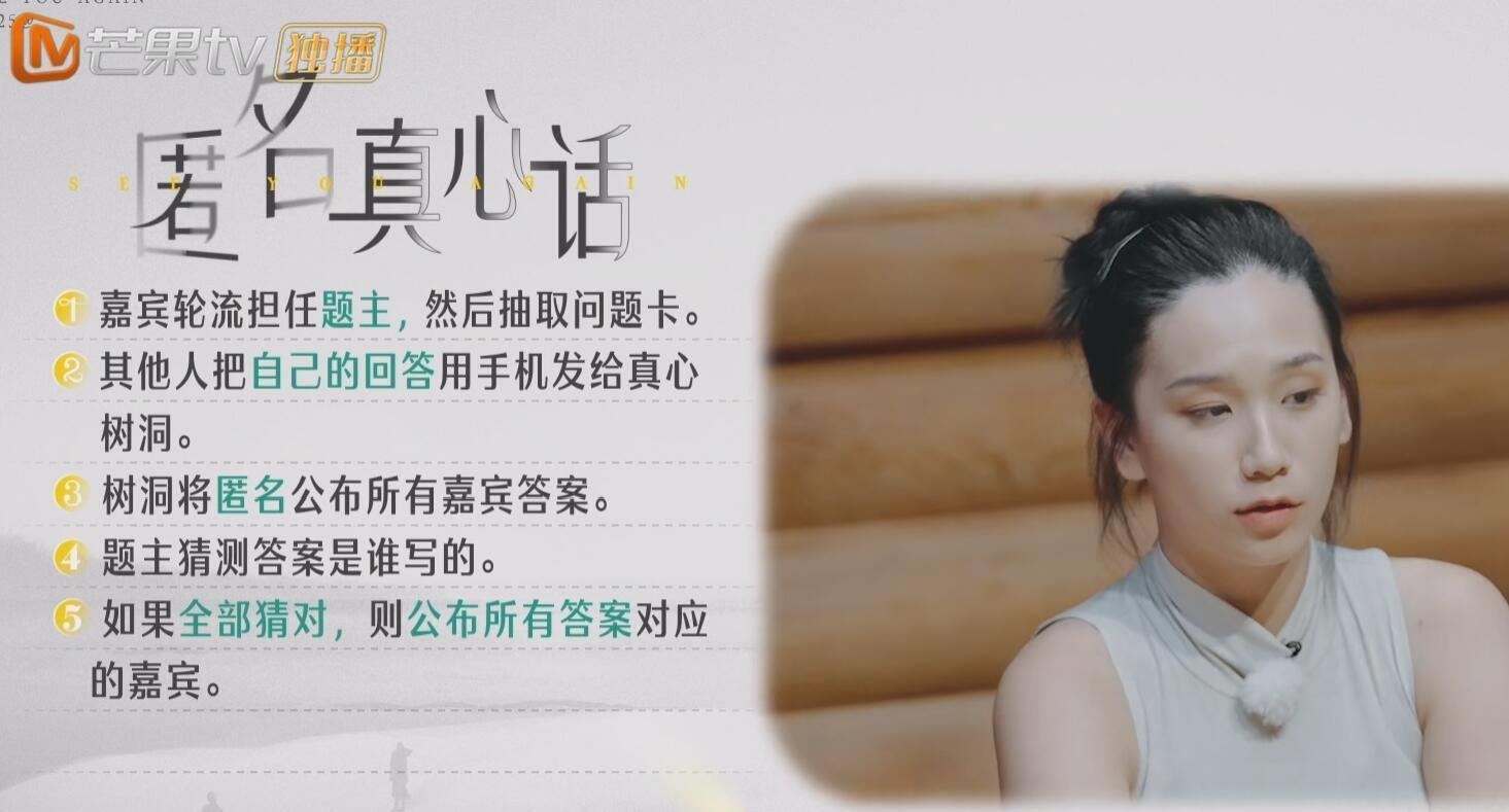 嘉宾轮流担任题主,然后抽取问题卡,其他人把自己的回答用手机发给真心树洞,树洞将匿名公布所有嘉宾的答案,题主猜测答案是谁写的,如果全部猜对,则公布所有答案对应的嘉宾。